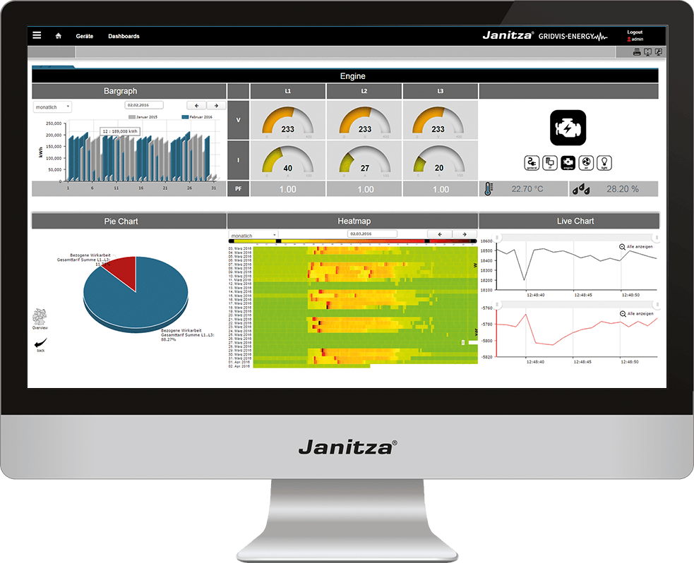 Система, описанная выше, может показаться громоздкой и сложной для внедрения и дальнейшей работе с ней. Но это не так. Установку можно начать с одного анализатора электроэнергии, смонтированного на точке разграничения балансовой принадлежности. Чтобы было понятно, насколько это просто, отметим, что компактный анализатор электроэнергии для непрерывного мониторинга Janitza UMG512E-PRO можно установить без отключения питания. Нужно всего лишь смонтировать трансформаторы тока на питающие кабели в главном распределительном щите. Встроенной памяти хватает на срок от нескольких недель до месяцев автономного измерения. Кроме того, этот анализатор относится к измерительным приборам класса А, внесён в реестр средств измерений и соответствует европейским и российским стандартам по качеству электроэнергии. В него уже встроен web-сервер, к которому можно подключиться с помощью любого компьютера, планшета или смартфона, и прямо в браузере провести анализ измеренных данных, а также посмотреть подробные графики случайных событий, записанных с выборкой на частоте 24кГц.