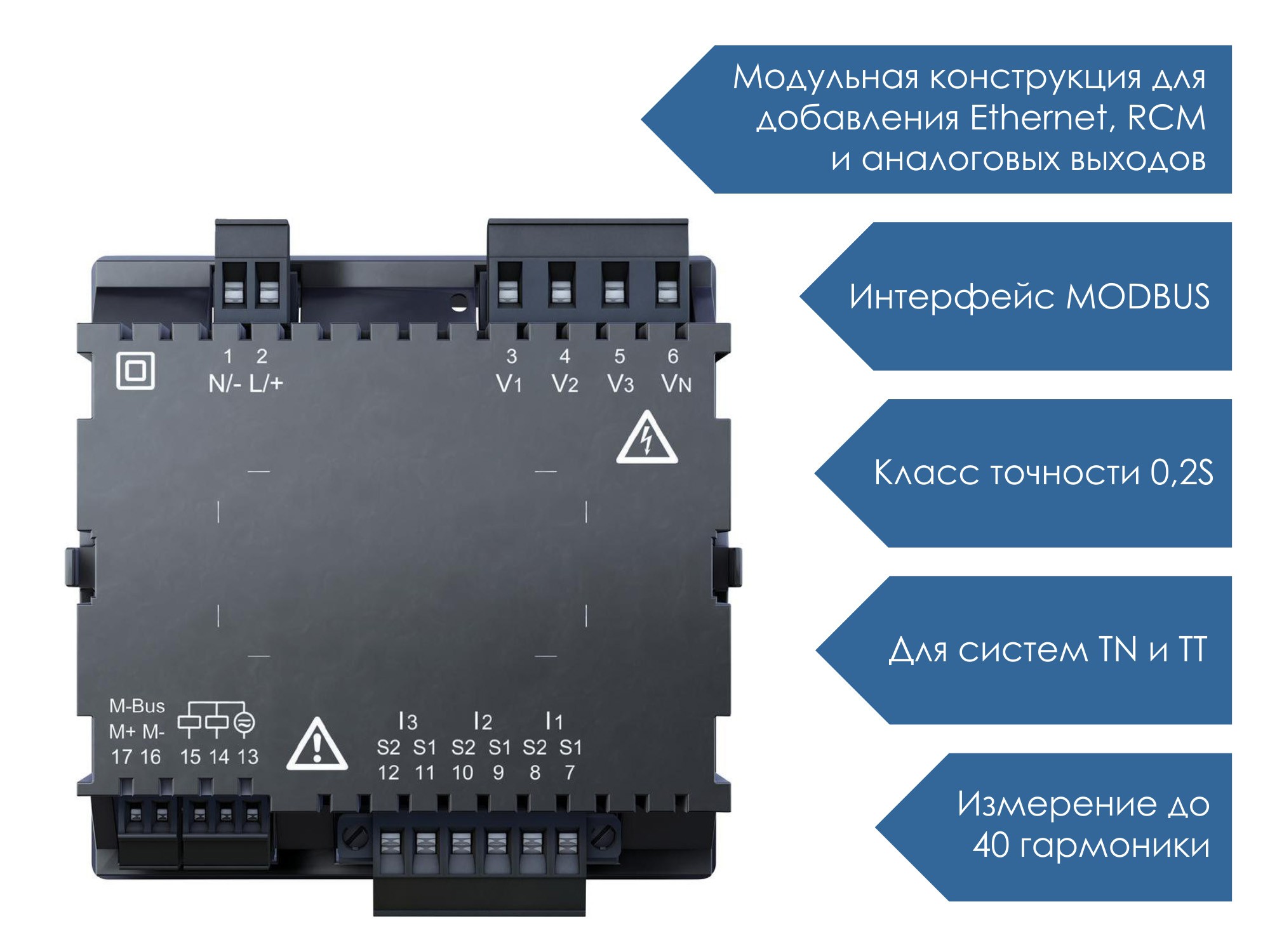 - RS-485 (Modbus RTU), питание AC/DC 90–250 В