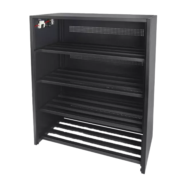 Конструкция выполнена на основе прочного металлического каркаса, включающего две несущие боковые панели и профильные полки для установки АКБ. Фронтальная, тыловая и верхняя стороны закрываются металлическими панелями, что обеспечивает безопасную эксплуатацию и исключает несанкционированный доступ к электрическим цепям.